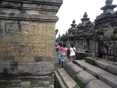 Maka mulailah kami mulai masuk lorong2 yang mengililingi candi. Sebisa mungkin gue menerangkan relief2 yang terdapat disepanjang dinding candi pada Adel, Aya dan Finda. Ya, meski gue gak bisa menceritakan secara detail maksud dari relief2 tersebut tapi setidaknya gue bisalah dikit2 menyampaikan apa yang tergambar dari pahatan2 dinding candi kepada mereka.
