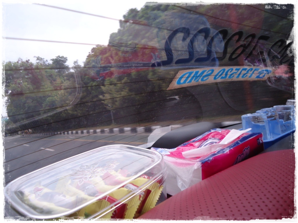 Awalnya saya sempet bingung. Makan? minum? maksudnya apa nih?! Tapi begitu pak sopir menyuruh kami menoleh ke belakang, saya baru paham. Ada beberapa gelas air mineral dan biskuit yang memang disediakan oleh pak safari sebagai servisnya bagi para penumpang taksinya.